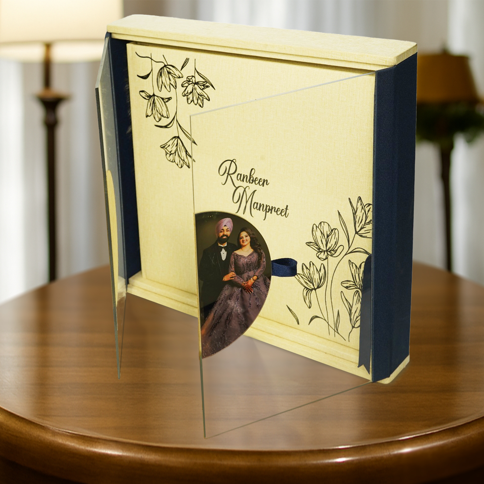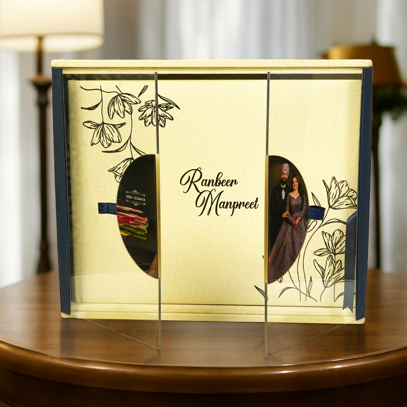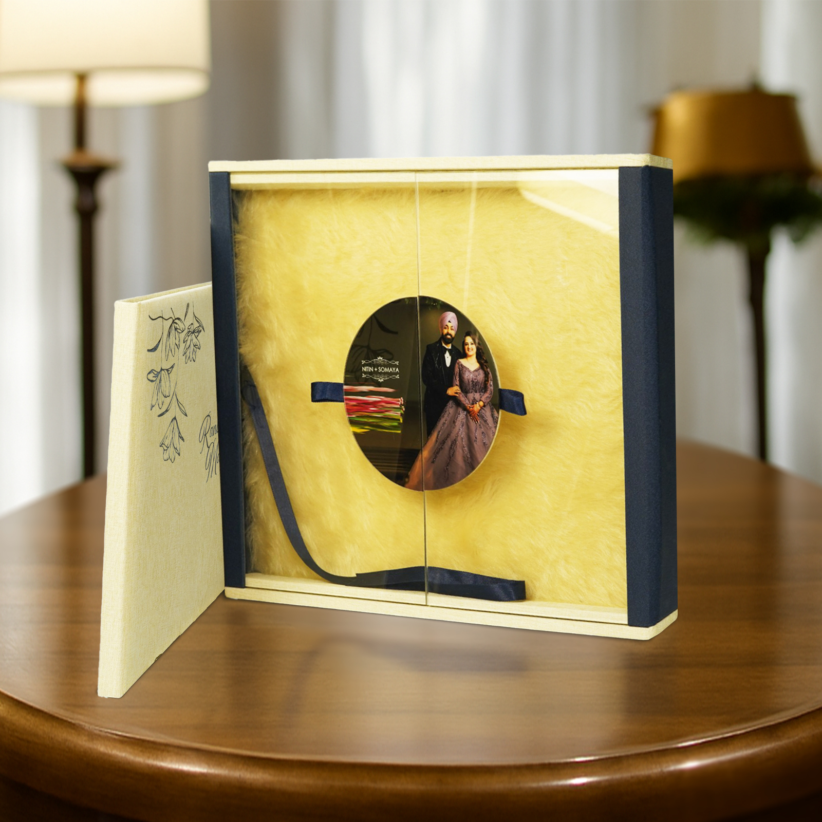 Glossy Premium Album Box is a high-quality keepsake box with two clear windows and a sleek design. It safely stores items like photos, heirlooms, or gifts. Made with durable vegan leather (Lycra) or soft velvet-like fabric (Alcantara), this box combines style and practicality. It’s simple design works well for gifts, photo albums, or storing special items.